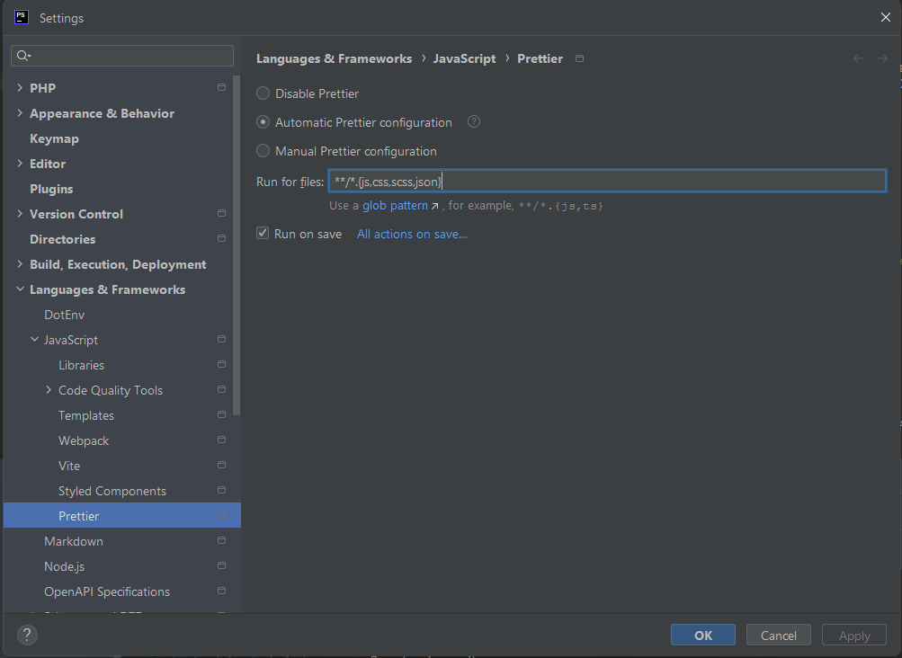 - Configurer le plugin dans Settings > Languages & Frameworks > Javascript > Prettier