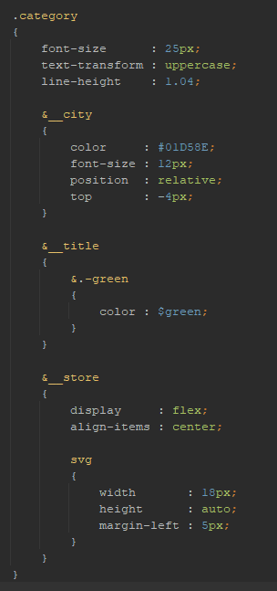 Dans l'exemple, .category est le Block, il contient plusieurs élements city, title, store. On peut donc personnaliser notre block puis développer le CSS de ses enfants de manière spécifique et lisible. L'opérateur "&" permet de ne pas répèter à chaque fois ".category" dans le code ou d'ajouter un modifier.
