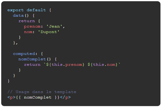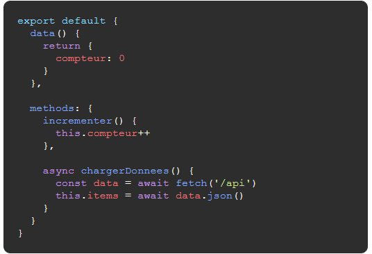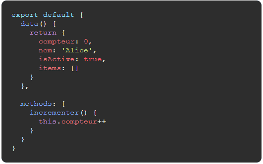 - Structure claire et organisée par options (data, methods, computed...)