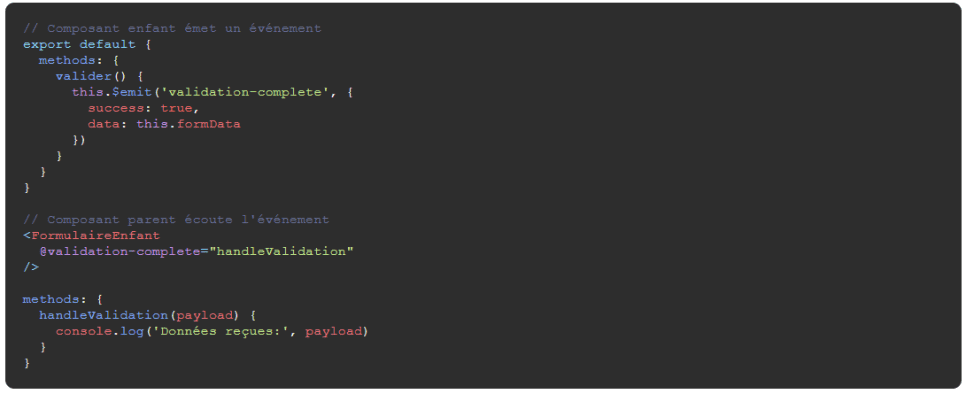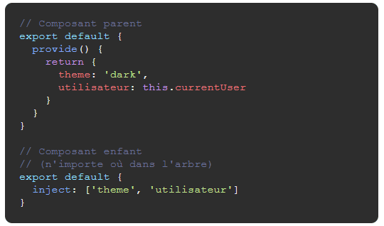 Pour le passage de données d'un composant parent à un composant enfant profondément imbriqué, il est possible d'uiliser le provide/inject afin de ne pas à avoir à passer les props dans chacun des enfants (Attention cette méthode de transmission des props est a utilisé avec partimonie)